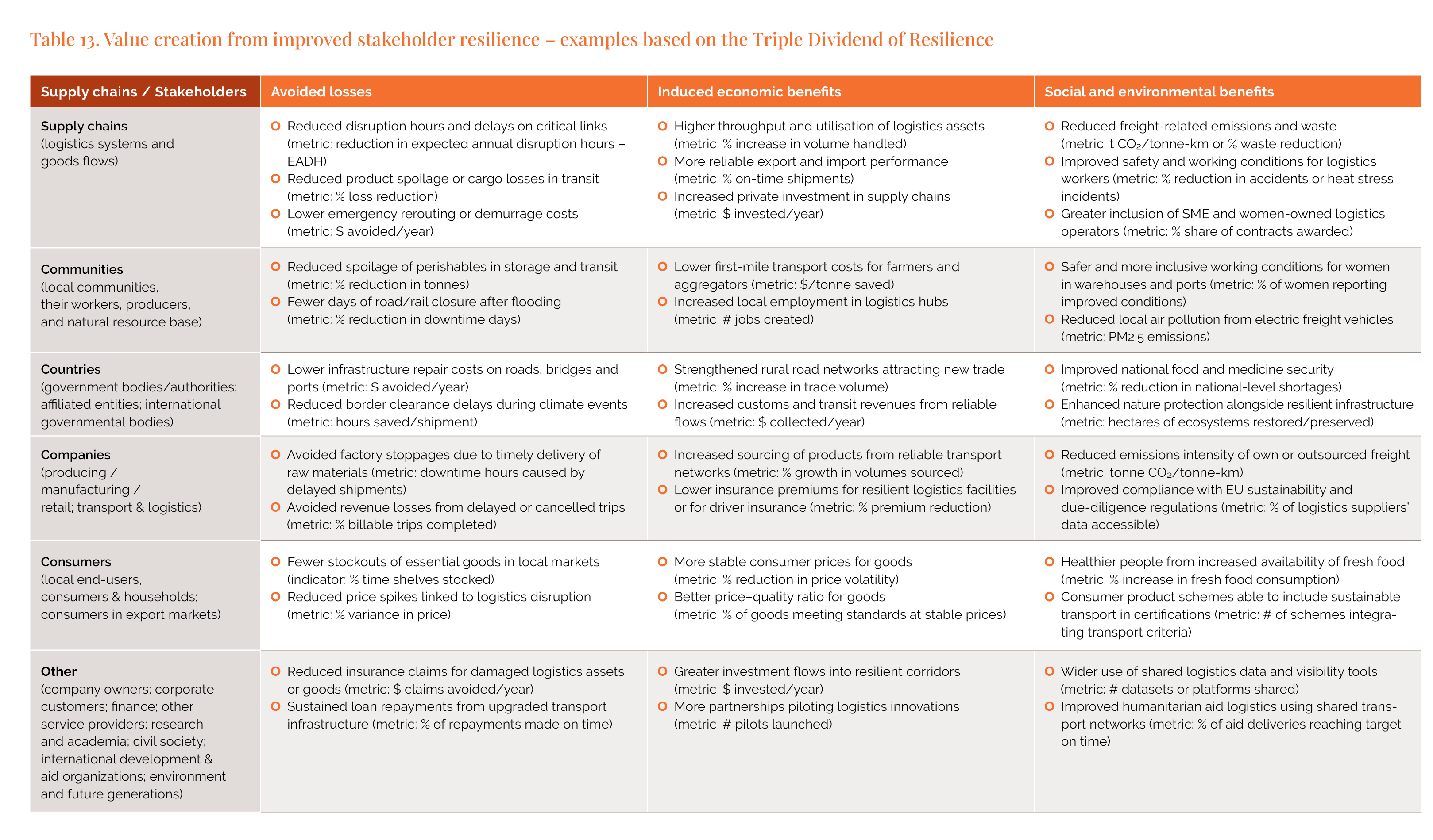 Table 13 gives examples of metrics/indicators that can be used to measure value at both the supply chain and stakeholder levels across the TDR.