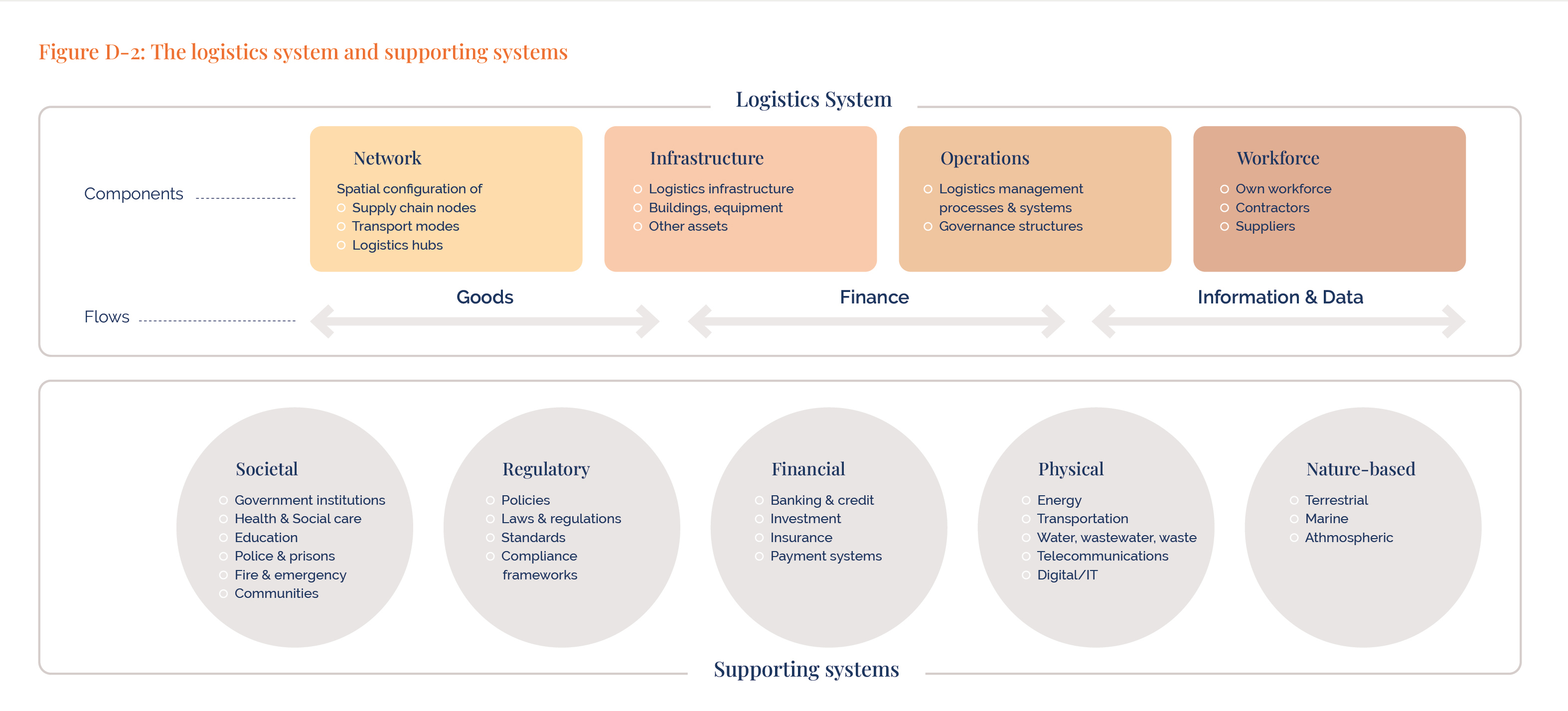 The figure below is based on the UNDRR 120, MCII 112 UNCTAD 116, UNEP 98 guidelines, ITF’s framework 8 and the KCC white paper 5. The logistics system consists of network, infrastructure, operations and workforce, and a disruption affects the flow of goods, finance or information and data. Supporting systems include societal, regulatory, financial, physical, and nature-based.